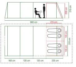 75 denier polyester (PE) flysheet, polyurethane-coated (interior) water-repellent treatment (exterior), P75D bedroom floor cover. Seams taped with heat-sealed strips.