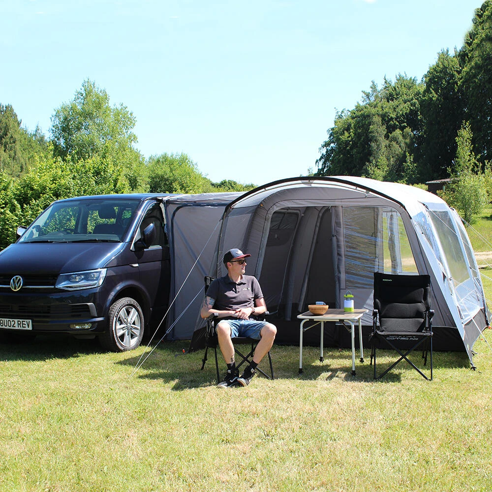 Introducing the innovative and versatile Cayman Combo Air drive-away awning. Its unique design offers mirrored access from both front and back of the awning giving complete flexibility to suit individual needs, this means the awning can be flipped to fit on both left and right sides of a vehicle. This hybrid awning is pitched using both air tubes and poles and is available in two ergonomic cowl height options to offer a great fit to the vast majority of campervan or motorhomes with a rail height of up to 255cm. To further enhance the versatility of this awning an optional Porch Door can be added to the front and/or back to give a fully enclosed usable space outside the main living area. The Cayman Combo Air comes with a wealth of features including a ‘fold-flat’ sewn-in groundsheet, mesh fly screen panels on all doors, and an option to add a 2-berth inner tent. Look no further than the Cayman Combo Air for style and versatility at a great price. Fixing Height 180cm – 210cm (Low). • 120HDE high density all-weather lightweight fabric