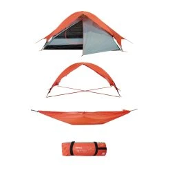 Very easy to pitch fibreglass arch structure that makes up the igloo-shaped bedroom. The flysheet fabric is made with the hammock and fits easily with 4 clips. The hammock and tarp are easily set up. Qaou’s modularity is quickly grasped and the transition from one configuration to another is easy.