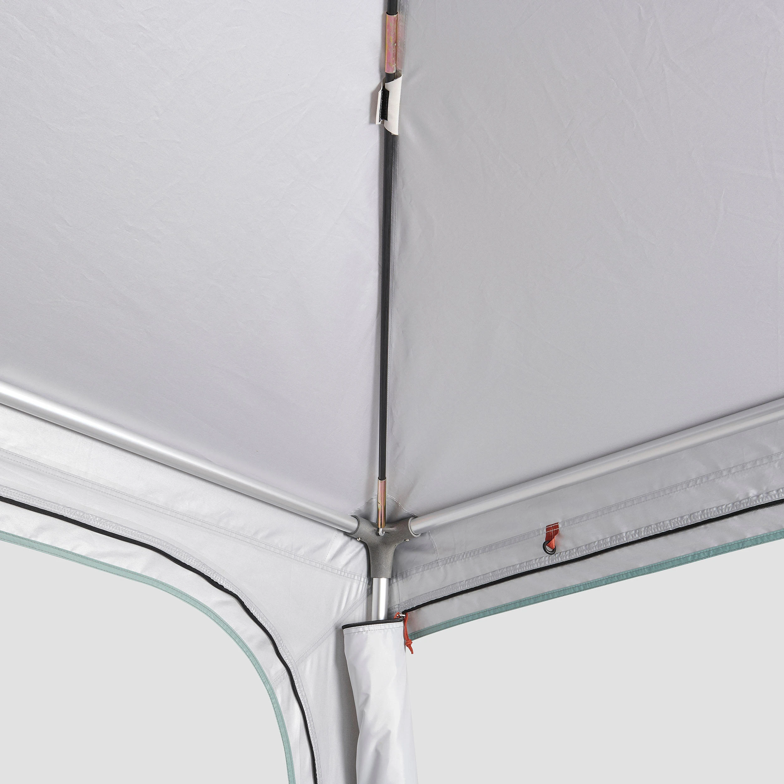 Simple to set up: aluminium tubes for the structure and fibreglass hoops for the roof. The living area structure is self-supporting.