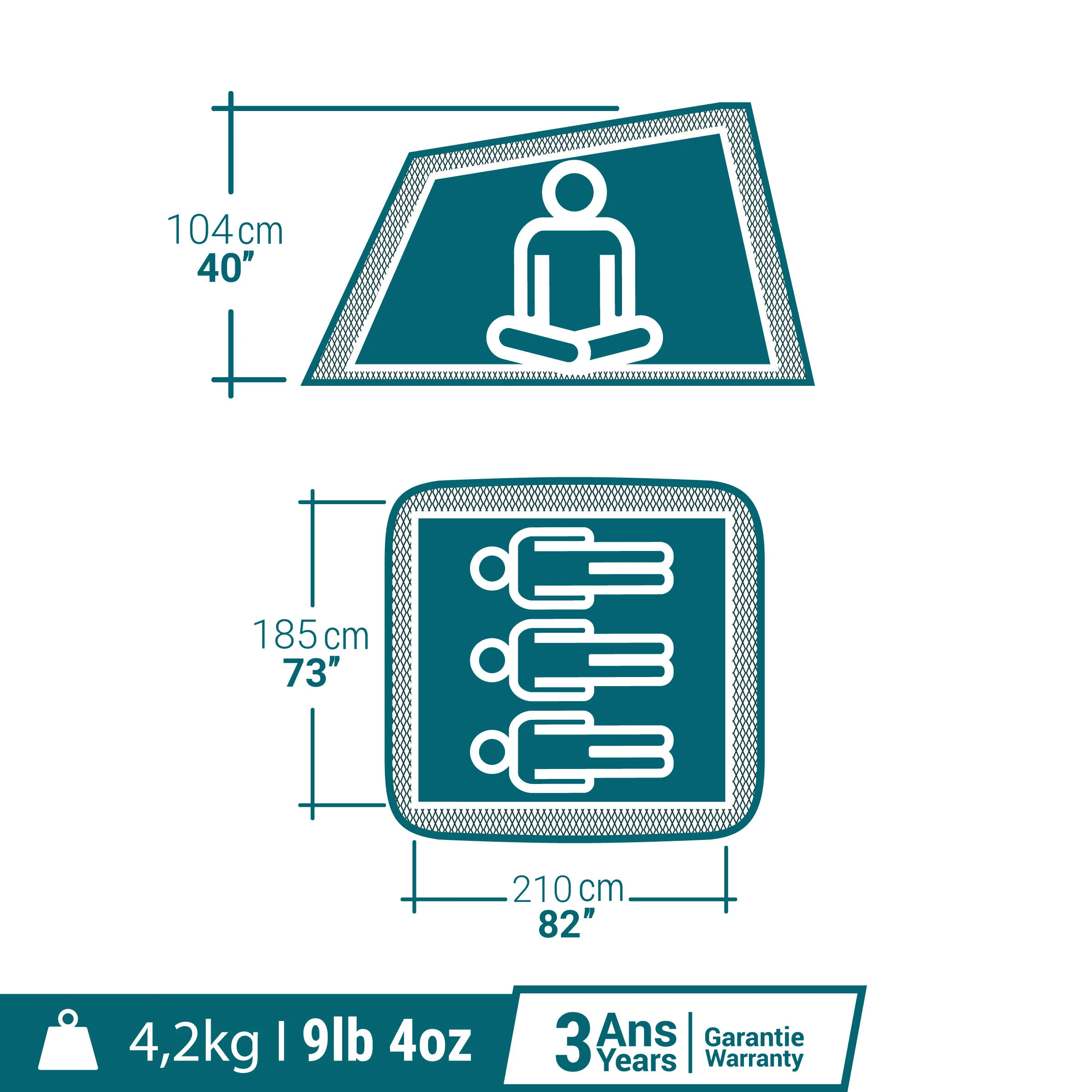 A surprise weekend? Our designers have spent time designing this three-person tent so that you can pitch it in a few minutes. It offers guaranteed mobility.Give yourself comfort, spacious rooms and good height. Leave your bags in the entrance without worrying about damp, thanks to the porch. And the guided folding system gives convenience as you leave.