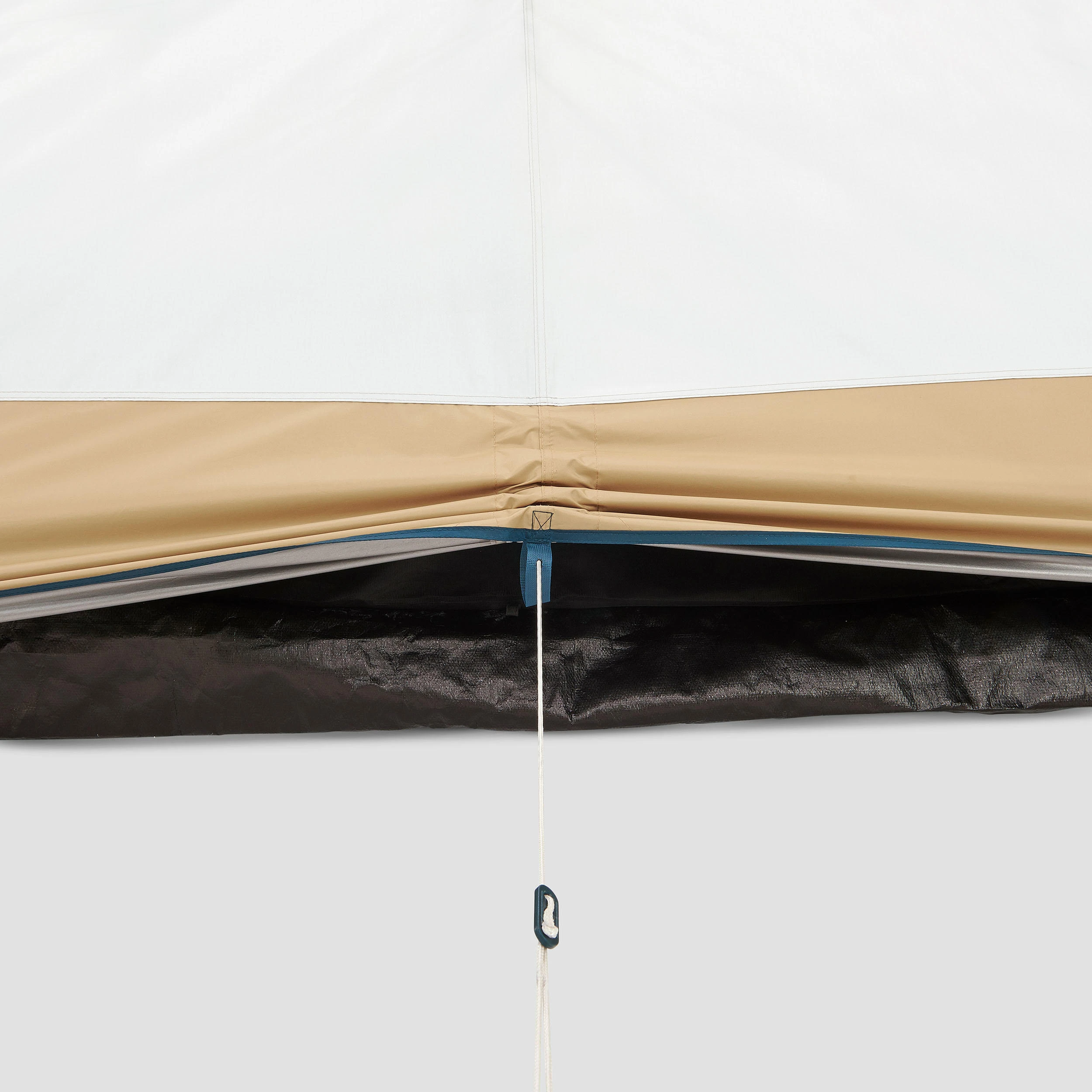 We test our tents to validate their waterproofing. The first test is done in the laboratory under 200 litres per hour per sqm of water for 3 hours, which is equivalent to a tropical shower of 200 mm per hour. The second test is done in the field under real-life conditions by our teams. This tent is fitted with a polyurethane-coated polyester flysheet measuring 2000 mm. It also has seams taped using heat-sealed strips and a 190 g/sqm polyethylene groundsheet.