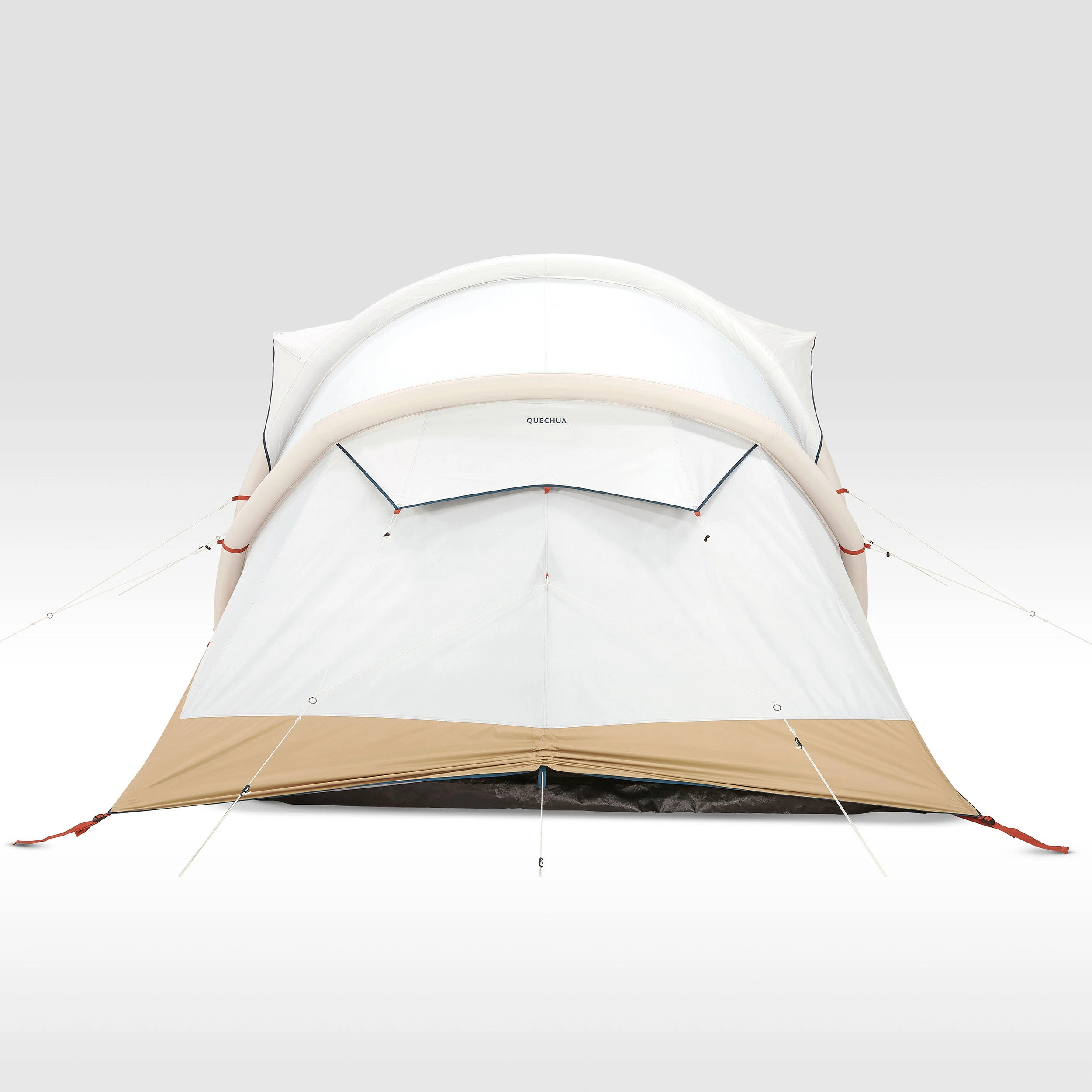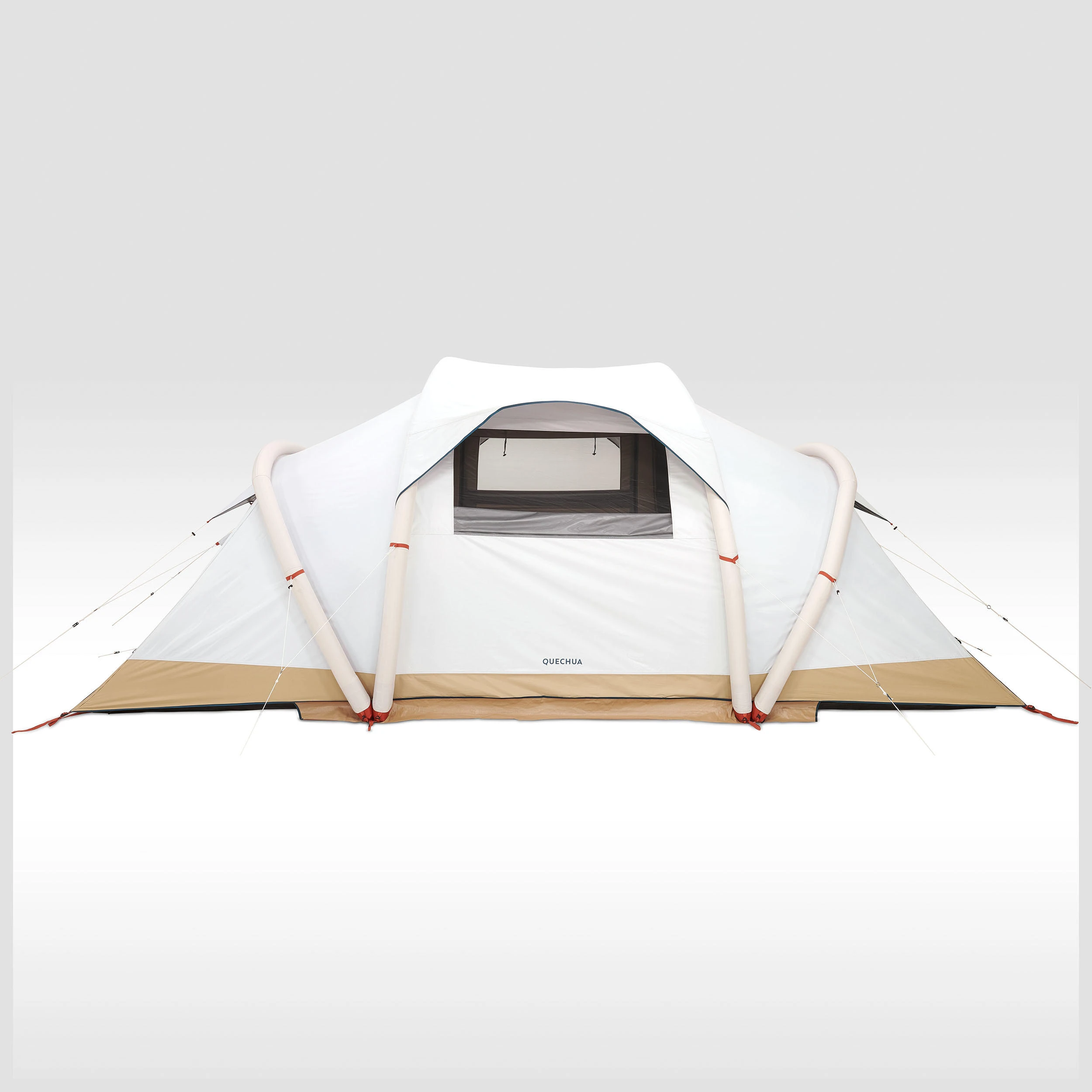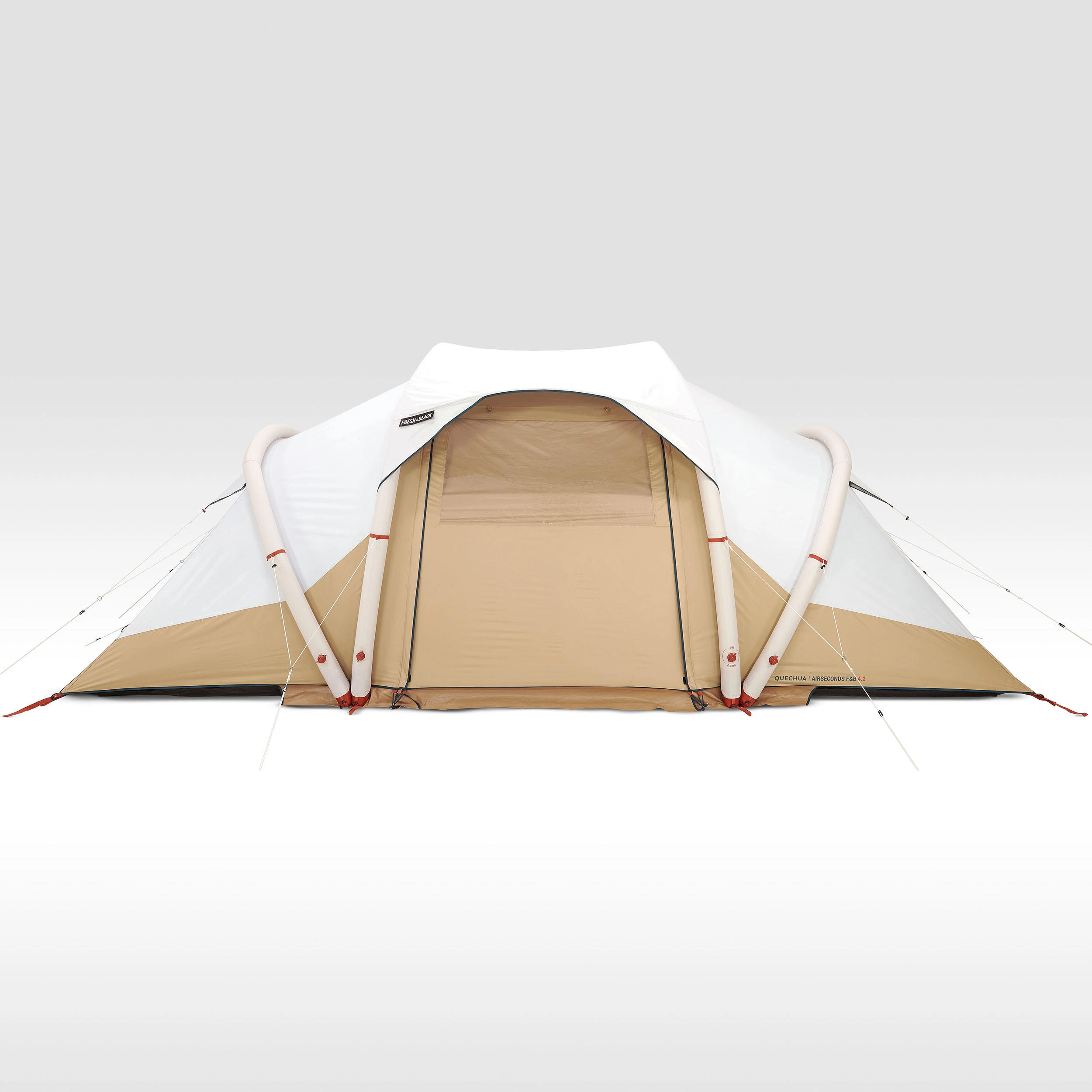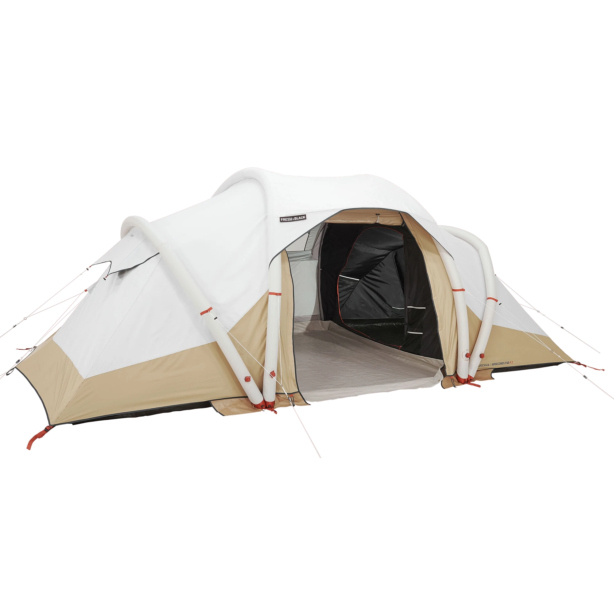 Inflatable all-in-one structure with pre-assembled bedrooms and flysheet.